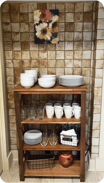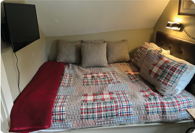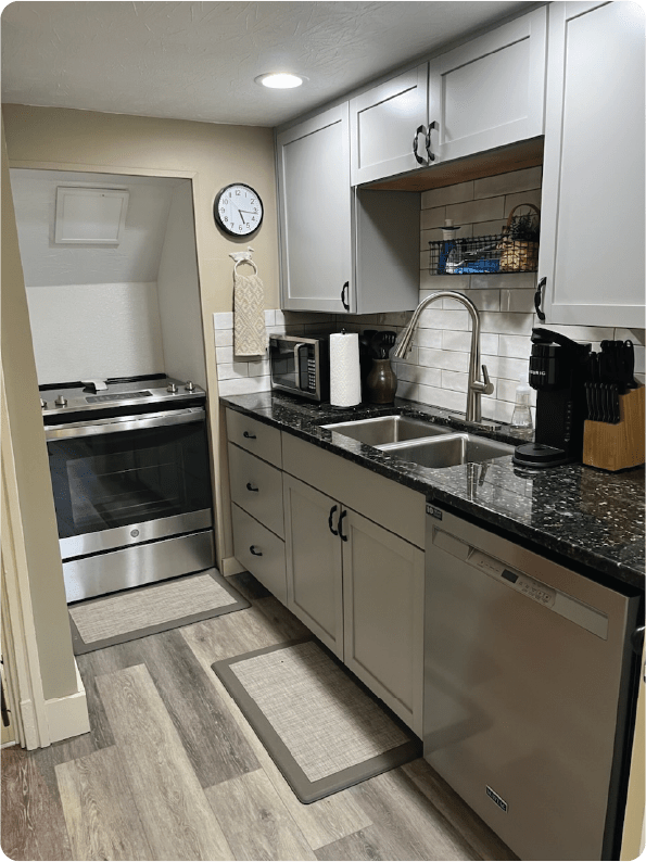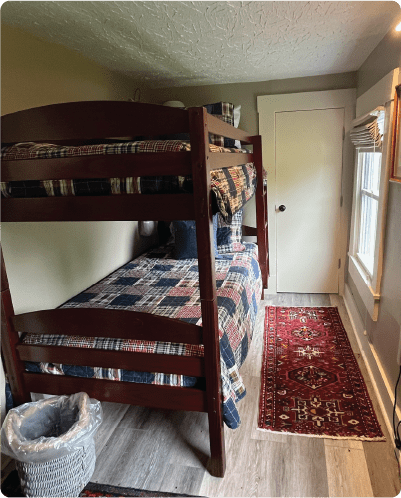 2 bedrooms (1 queen bed and bunk bed set (2 beds) plus efficiency kitchen with full size stove and oven, refrigerator, microwave, dishwasher, toaster, Keurig coffee maker, electric tea kettle, all glassware, dishes, utensils, cooking and serving utensils, pots and pans, and other miscellaneous cooking and food prep items (kitchen is well stocked)