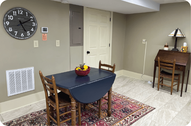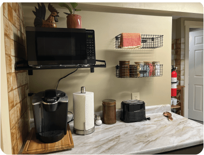 Large studio apartment with 2 twin beds plus queen size pull out sofa. Efficiency kitchenette with refrigerator, microwave, crockpot, toaster, Keurig coffee maker, electric tea kettle, all glassware, dishes, utensils, cooking and serving utensils, and other food prep and serving items (the kitchen is well stocked)